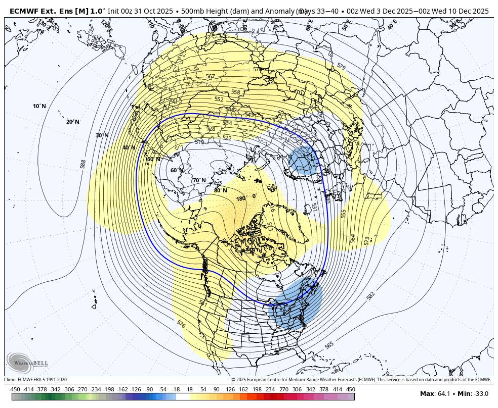 This is what the extended Euro ens is spitting out for December starting at the end of this month. There are several signs that this may come to fruition with the mjo plots moving into favorable forcing and the PV weakening towards the second half of November. When I analyze the broader, reoccurring pattern, the signals are clear — a –EPO / +PNA/-NAO/-AO setup tries to re-establish by mid to late month. This combination supports a stronger ridge in the West and a deepening trough across the East, allowing colder air to funnel south from Canada. I am a bit skeptical because the Euro monthly and weeklies kind of burnt me last year. They did well for January but crapped out elsewhere along the season. Ill have more right ups a bit later on a modern day record IOD that will affect this winter as well. Sent from my SM-G998U using Tapatalk