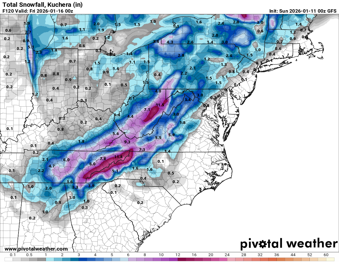 12z GFS is back this run for the Sunday chance with another CTP Advisory level event with heavier amounts to our east. Snow map is Only for the Sunday period. -