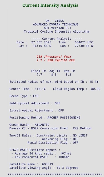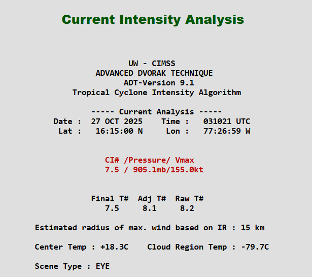 Granted, Melissa's ADT is stronger than ETA's ever was. I think Eta got down to around 918 hPa on ADT, but recon found it to be 10 mb higher. Thus, it never achieved Cat 5. Eta was also embedded inside of a WCARIB surface trough. Melissa's pressure regime is a little higher. So if it is indeed found by recon to be pushing the 910s or 900s hPa tonight, the gradient should support 140+ kt surface winds. But, yes, it would be surprising if ADT busted that hard again.