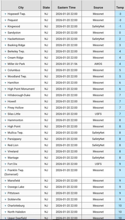Current temperatures at or below 10 across NJ. Only made it to 19 here today under bright sun. Currently 8. Cold my all accounts I'd say.