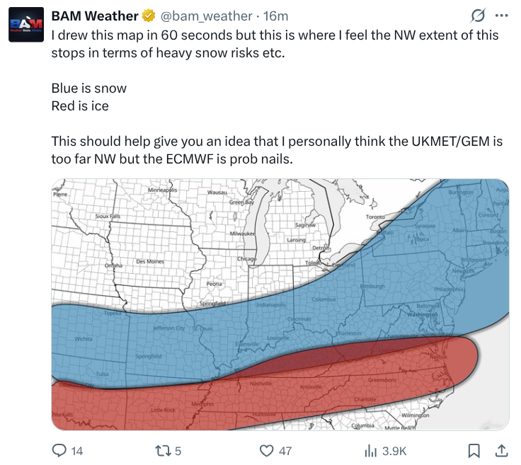 Looking at everything, I think some here are really hung up on the sleet mixing and not enough on the absolute drubbing that WAA pattern is going to bring for the thump up front. This is a setup that can rival the Feb 2014 thump in places. The initial 4hrs when snow becomes heavy too will be big beautiful dendrites in the stronger bands. 1-2”/hr rates likely with some bands >2”/hr considering the strength and depth of the FGEN and DGZ, respectively. If you can remember 2014, there was 2’ of snow in Mt. Airy and not a single model showed that until it basically on top of us. Use climo, know your area for who usually hangs on to snow the longest. This will be a crazy beatdown prior to any flip. Lowlands will mix, metros will mix, eastern shore will mix, and mix will likely make it to I-70….it is what it is. It’s the nature of an upper pattern closing off west of where we want it. However, the snow will come in hot and heavy and last for a while to bring in some great totals, the biggest of which some have seen in a decade. Thermals will be situated as we get into Friday and the NAM Nest comes into line. That’s the model I want to see. That piece of guidance usually sucks, but it does do well at showing the thermal progression while sucking otherwise. It’s gonna snow y’all!! As for Southwest VA, it sucks this shift happened so abruptly. I wasn’t anticipating THIS much of a shift, but there will be some heavy heavy snow upfront before driving sleet. It will be a high impact scenario for so many. And the cold afterwards is NO JOKE!! This isn’t going anywhere.