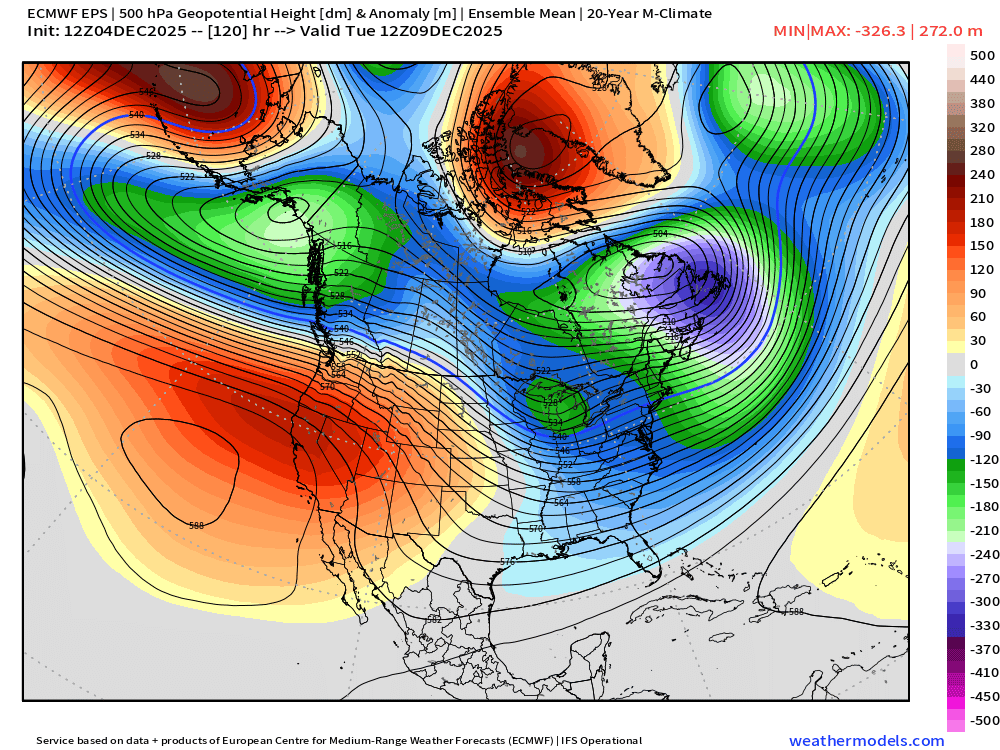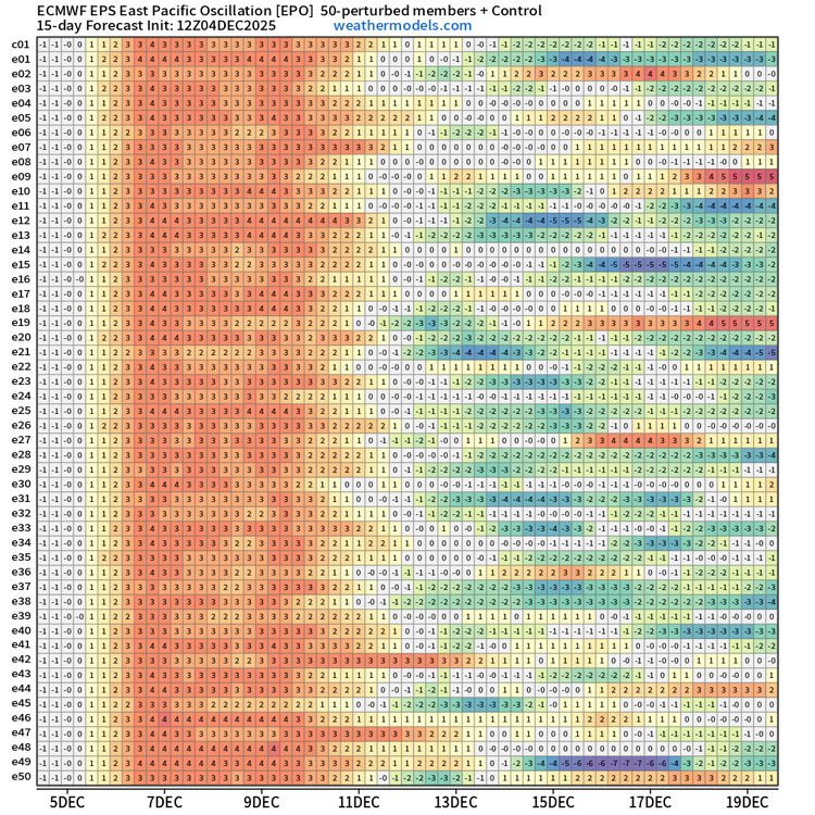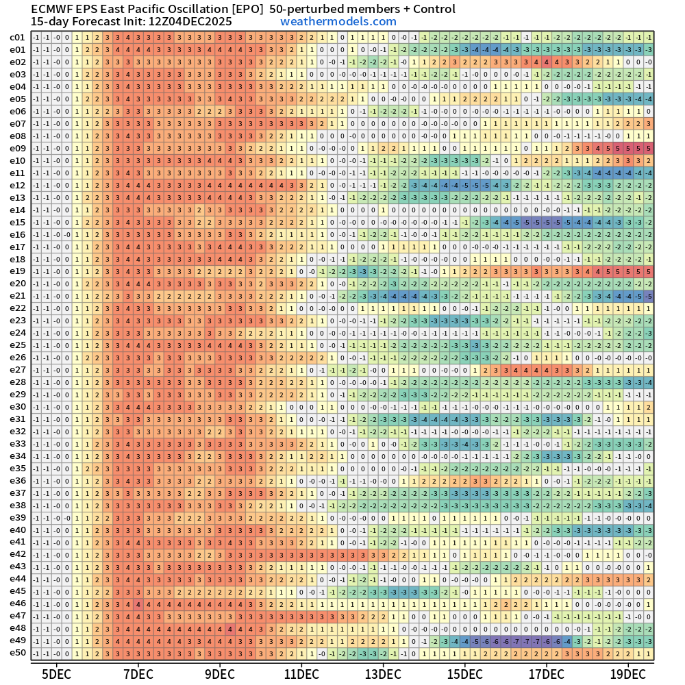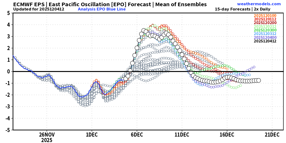 I agree that the -WPO will remain the most dominant influence on the cold through mid-Dec. However, there are increasing indications that in the 10-15 day period (Dec 13 and beyond), the center of the most anomalous ridging will shift significantly NE from the Kamchatka Peninsula/western Bering Sea to the Bering Strait, with the eastern extent of positive anomalous also shifting notably eastward into AK and even parts of the Northwest Territories. Combined with the increased negative anomalies north/NE of Hawaii and below normal heights over the NE US, that suggests a -EPO. This more eastward position of the ridging could theoretically allow the most anomalous cold air to be directed toward the NE US beyond Dec 15, though the lack of ridging over Greenland and the relatively northward position of the polar vortex indicated by the guidance e.g. north of Hudson Bay (I am mainly speaking about EPS and GEPS) would counteract this.