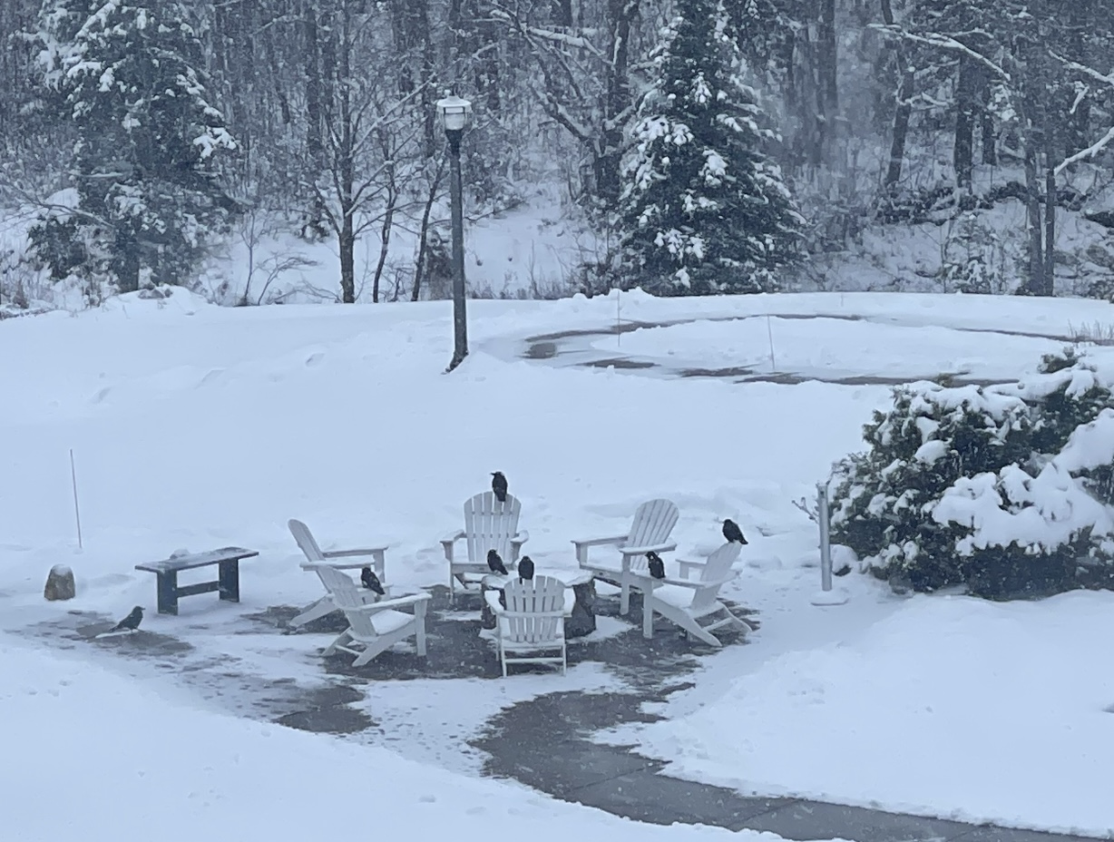 Still snowing nicely up north. The crows seem to have formed a committee to hash out the details of the pending warmup. -
