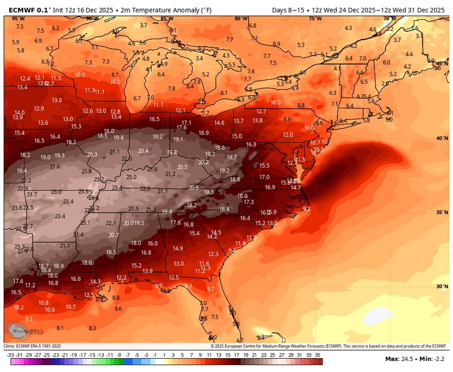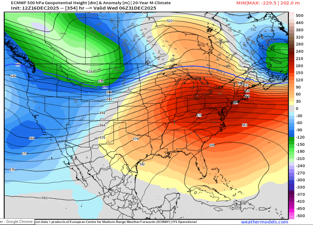 Definitely took an anomalous pattern to get December cold and snow in the east. Been record breaking warmth in the southwest (where I’m currently at for the next week or two). Usually in the upper 50s in Vegas this time of year, but it’s been close to 70 each day so far since I arrived last week. I think the Rockies are also below normal snowfall so far. I’d like to see a “normal pattern” develop in January…one in which Frederick can get a warning level snowfall from an ol’ TN Valley wave and a blocking high to the north. TBD