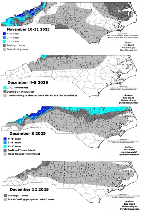 I take issue with Eric’s maps. A trace is measurable and I can say definitively that no location south of Yadkin County in the NC foothills has seen a trace this year. He has my area marked at 4 “trace” events. Our best event was a 2 hr period of off and on light snow that melted on contact.