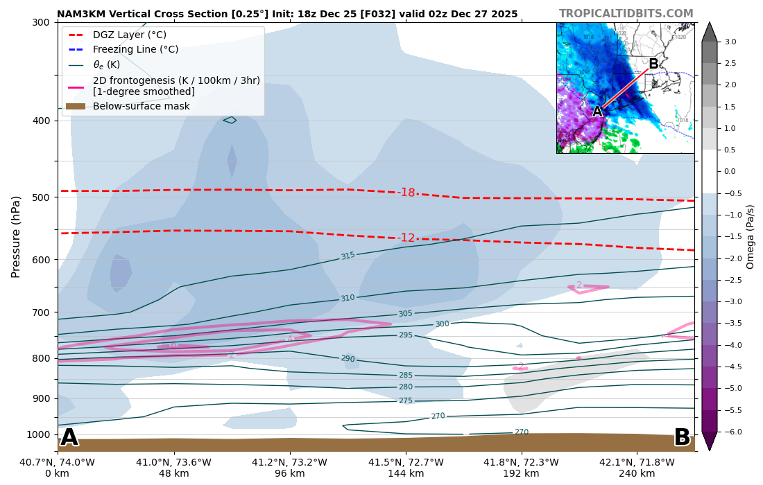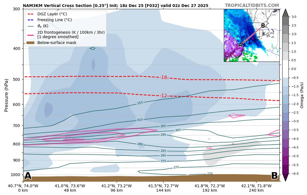 Looking at things a bit...most of the modeling seems to have good ratios in the SW 1/3 of CT back to about POU and into LI. There's good omega in that H5-6 layer where the max DGZ is even though that warm nose/fronto tries to punch in around H7 in NYC metro. The lift tails off pretty quickly N and E of there. Maybe a period of 12-15:1 avg ratios in that max zone and then stick closer to 10-12:1 near a DDH-PVD line. Whoever gets in on the fringes in that 0.15" or less area is likely battling the low level RH and having some of the crystals getting eaten up a bit. Maybe a little OES enhancement along the Cape too? Here's a little x-section from the 3k nam for tomorrow evening. I'll be lucky to get a flurry here. That wind is roaring right now too...have had a few 35mph gusts on the Davis which is probably more like 45mph with better siting. -