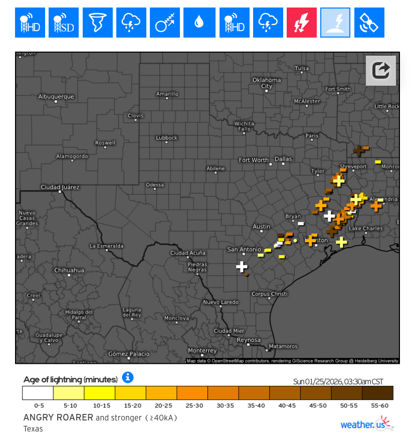 Winter wx convective instability is really starting to pick up in ETX/SETX. Very good amount of stronger CG strikes for this scenario. Even a decent amount of positives!!