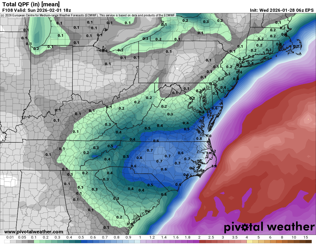 At the surface, cyclogenesis appears likely just off the Southeast coast, where a weaker but still prevalent baroclinic zone is forecast over the Gulf Stream. The primary front is expected to be still draped across the Bahamas, setting up a probable instant occlusion low surface pattern. The low off the Carolina coast is expected to rapidly deepen Sat into Sat night, as stronger synoptic ascent overspreads the Gulf stream and the main synoptic front is pulled northward. On the backside of the low, an Arctic airmass will become locked in over the Mid-Atlantic as the low deepens off the coast, resulting in potentially record breaking low max temperatures during the event. This pattern is favorable for at least light snow with a high snow/liquid ratio within central NC, but also brings an incredibly difficult forecast challenge related to a deformation band on the north and west side of the deepening low. The likelihood of band formation, let alone its timing and placement, remains a point of considerable uncertainty and may not be ironed out until 1-2 days before the event begins. However, the top analogs and latest suite of 00z model guidance highlights at least the potential for significant snowfall totals somewhere from the Carolinas into the Mid-Atlantic. There are a few failure modes for this setup which would result in less precipitation over central NC. The first is the placement and the latitude the mid/upper level low closes; minor adjustments will have potentially significant ramifications on if/when/where the deformation band sets up. The second is that some degree of cyclogenesis will occur along the primary baroclinic zone over the Bahamas and may draw stronger ascent, moisture, and related liquid equivalent and snow amounts away from the instant occlusion-type, nearer-shore coastal low. -