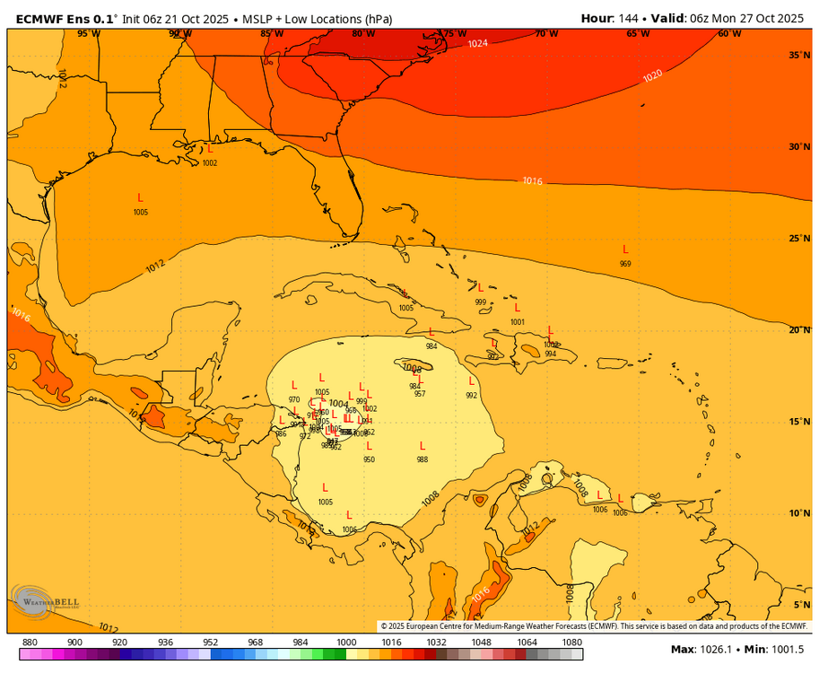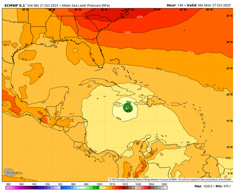 1. 6Z Euro 144: significant shift NE vs 0Z 150 and 12Z 162 (which were both 150-200 miles SSW to SW of Jamaica) with the 6Z 40 miles E of Jamaica. That’s a 200-250 mile NE shift from the 0Z/12Z! 2. Tropical Weather Outlook NWS National Hurricane Center Miami FL 800 AM EDT Tue Oct 21 2025 For the North Atlantic...Caribbean Sea and the Gulf of America: 1. Caribbean Sea (AL98): Satellite, radar, and surface observations indicate that the area of low pressure over the central Caribbean Sea appears to be developing a well-defined center, and is already producing winds up to 45 mph. A tropical storm is expected to form later today while it slows down over the central Caribbean Sea. Heavy rainfall and gusty winds are possible over portions of the ABC Islands during the next day or two. Interests in Puerto Rico, Hispaniola, Jamaica, and Cuba should monitor the progress of this system as there is a risk of heavy rain and flooding, strong winds, and rough surf later this week. The Air Force Hurricane Hunters are scheduled to investigate the system later today. For additional information on this system, including Gale Warnings, please see High Seas Forecasts issued by the National Weather Service. * Formation chance through 48 hours...high...near 100 percent. * Formation chance through 7 days...high...near 100 percent. High Seas Forecasts issued by the National Weather Service can be found under AWIPS header NFDHSFAT1, WMO header FZNT01 KWBC, and online at ocean.weather.gov/shtml/NFDHSFAT1.php Forecaster Cangialosi