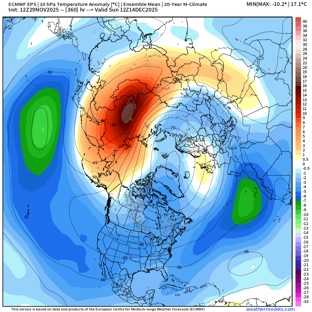 I feel like it's worth a casual mention that the EPS has been seeing some new Siberian warming cropping up at the end of recent runs. Today's 12z has continued with that thought. GEFS however has not been showing much interest in this idea.