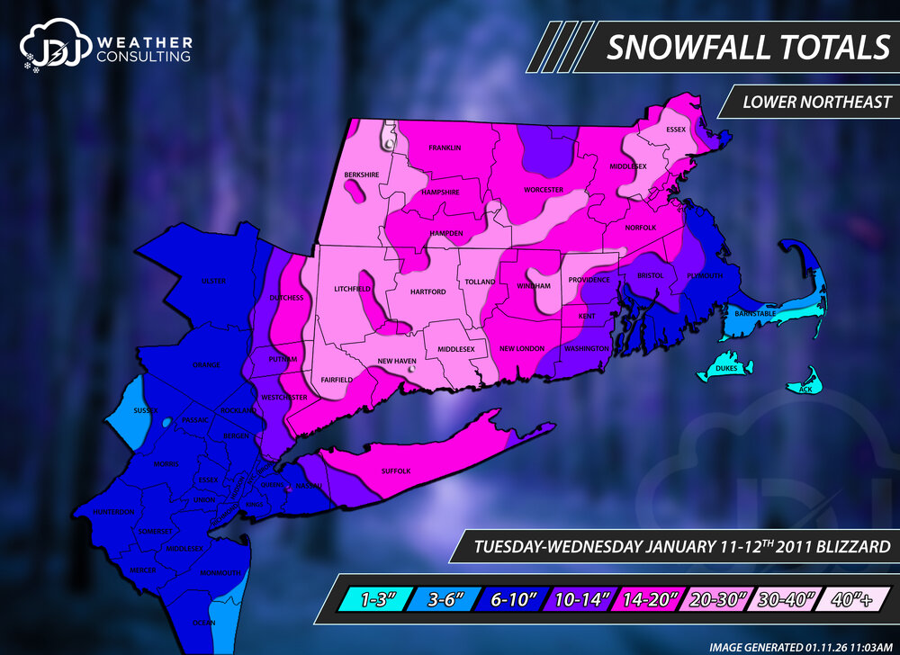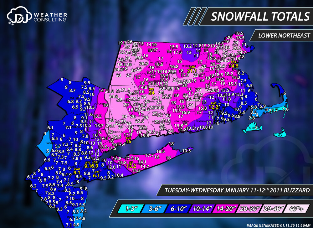 Today is the 15 year anniversary of one of CTs biggest snowstorms on record. BDL #1 all time with 24". And overall probably the 2nd biggest (for CT in general) in the past 30 years. Just finished redoing all these maps for accuracy and to include Lower Northeast view with climo sites. One of the most perfect radar evolutions for SNE and especially CT. This storm is actually the only storm i've done that has a 40"+ contour other than 1888. Savoy, MA 40.5", Florida 33", North Haven 30.5" https://www.jdjweatherconsulting.com/post/15-years-ago-january-2011-blizzard Contours only