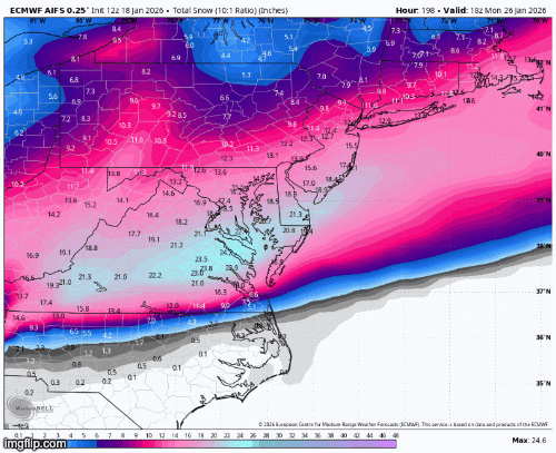 Agree, given the current setup look, suppression is more likely in terms of how this could fail. But I'd still like to be optimistic (won't necessarily say "confident") that even a bit of suppression where we end up on the northern edge of the best snow would still be a win for us. That would still be warning-level snows, literally cold powder. I think last night's Euro showed that scenario? Heck if we can even increase the amount of moisture being thrown into the cold air, expand the precip shield, that would be nice too. -