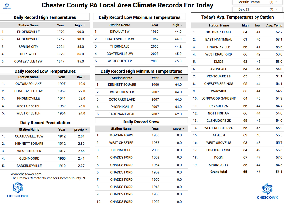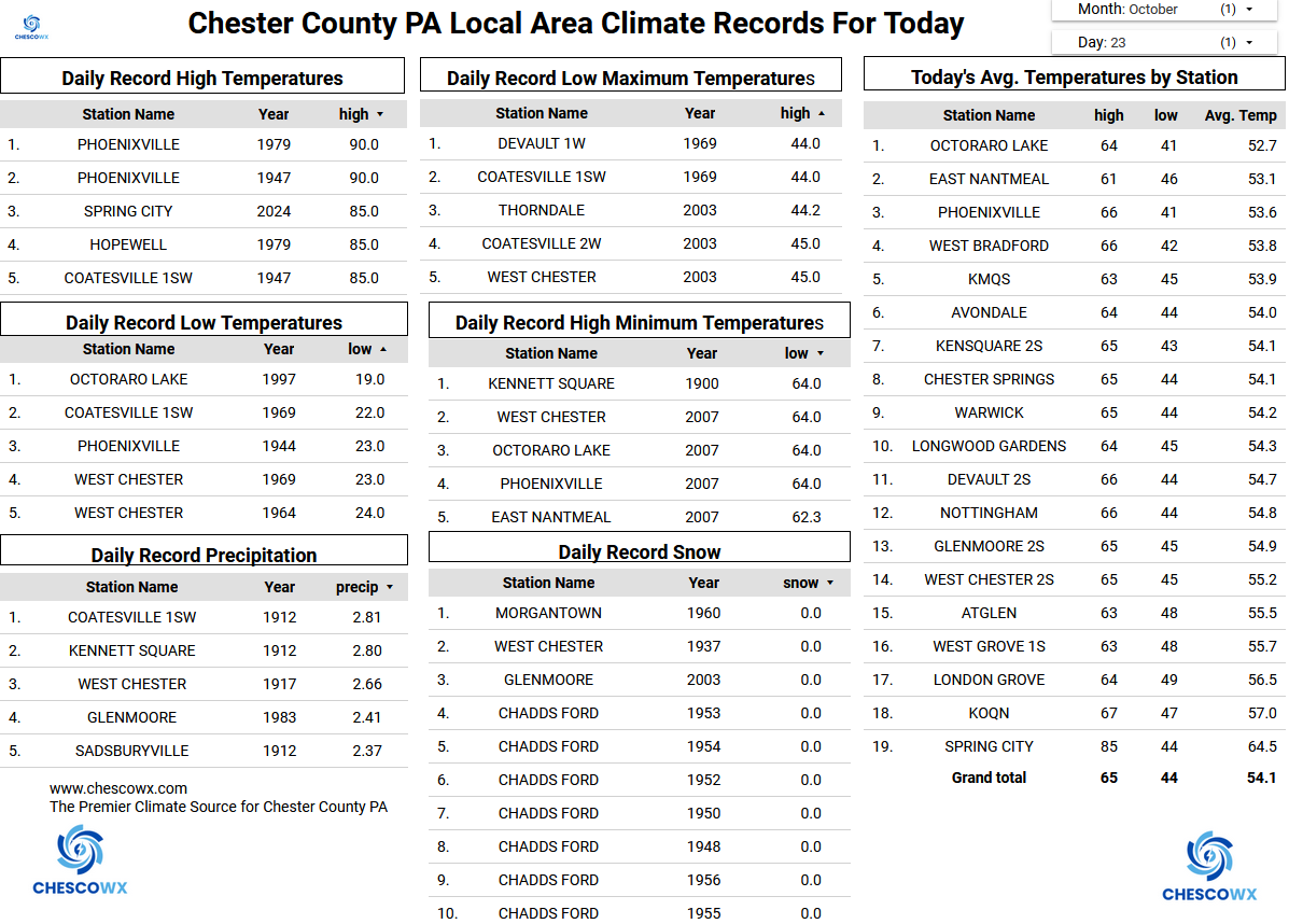 The NWS has issued a Frost Advisory for tonight for the entire area. However, many spots below 500 ft ASL in Chester County have already seen multiple freezing mornings. Those valley spots may again see freezing temperatures while some higher spots could see some frost but likely staying above freezing. For the rest of October, we should see below normal temperatures with daytime highs falling from the upper 50's today to the low 50's for highs by the start of the new work week. Lows should be frosty most mornings with a widespread freeze possible by next Monday and Tuesday mornings. We stay dry until our next chance of showers on Tuesday night. -
