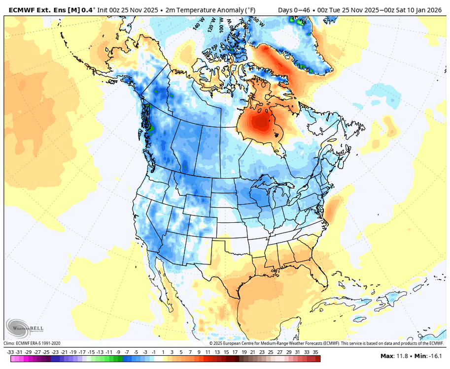 Euro Weeklies 46 day 2m temp anomalies: 11/25 run: NYC and Chicago -3F 11/30 run: NYC -6F, Chicago -8F (would be coldest in many years for that period)