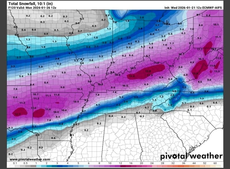 AIFS / Euro AI doesn't have a direct ice chart, but here is what I discern from QPF and time the sounding is ice for KCHA. Might start as sleet but goes FZRA pretty quickly. Through Saturday night 1 to 1.5 inches QPF is over 1/3 inch ice and possibly a half inch ice accretion here. Anything greater than that (and it's definitely on the table) gets historic. Points to my northwest (Middle Tenn not necessary BNA) have over 2 inches of liquid rain locally 2.5. Some of that has to come as sleet. Still could be well over a half inch of FZRA with plenty of 3/4 inch reports.