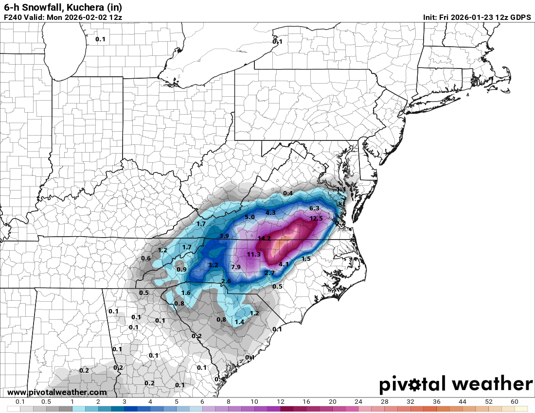 Now the GFS gives southern Louisiana across Mobile, and all of the Florida panhandle 8-12 inches of snow with 0 warm nose issues 150 miles north of the low. Yet here we see 850s shoot to 50 degrees with a low 1000 miles south of us. It finishes off with a band of ocean effect snow that sends 2-4 inches from Tampa Bay down towards south Central Florida. While this clearly shows that the GFS probably needs to be decommissioned and a new model launched in its place, I wouldn't be shocked if it came true.