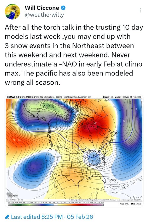 Overnighters look to have flattened the flow, which makes more sense to me. While nao and ao are on the rise,both still in - territory next week. Add to it - pna, a flatter look seems reasonable. Beyond that...dunno, but next week still doesnt look bigly warm to me. Every week we add to this awesome stretch is fine by me. Spring will be springin soon enough and it'll make the warmth feel gooder. Headed north in a few hours. Have a great weekend all. Bundle up and enjoy the snow. - Today