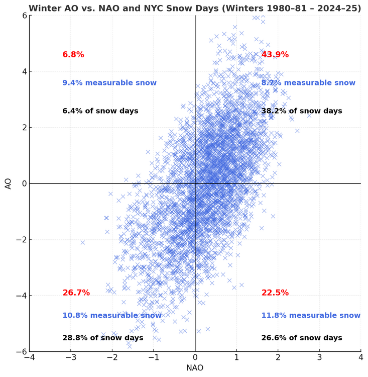 At least for NYC, the AO is a bigger factor. Red text=% of days e.g., AO-/NAO-; blue text: % of days in the quadrant with measurable snowfall; black text: percentage of total days with measurable snowfall. This is December-February/winter data. -