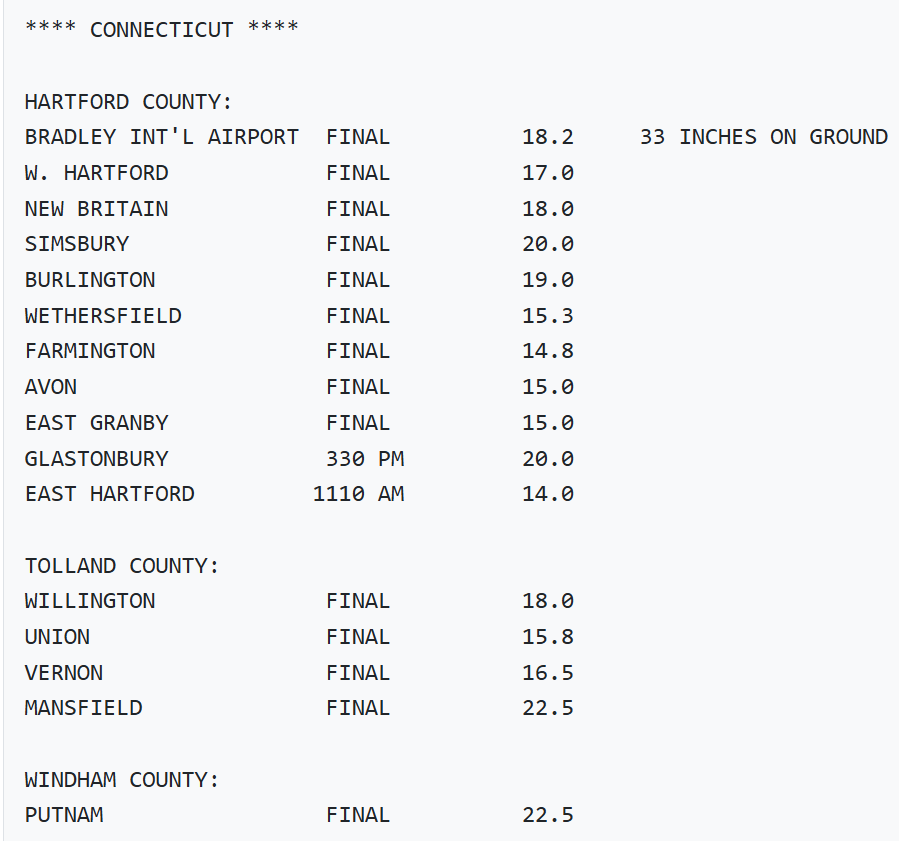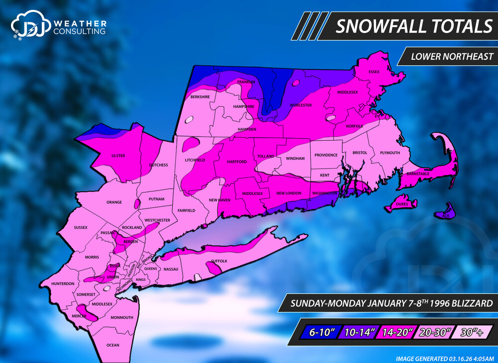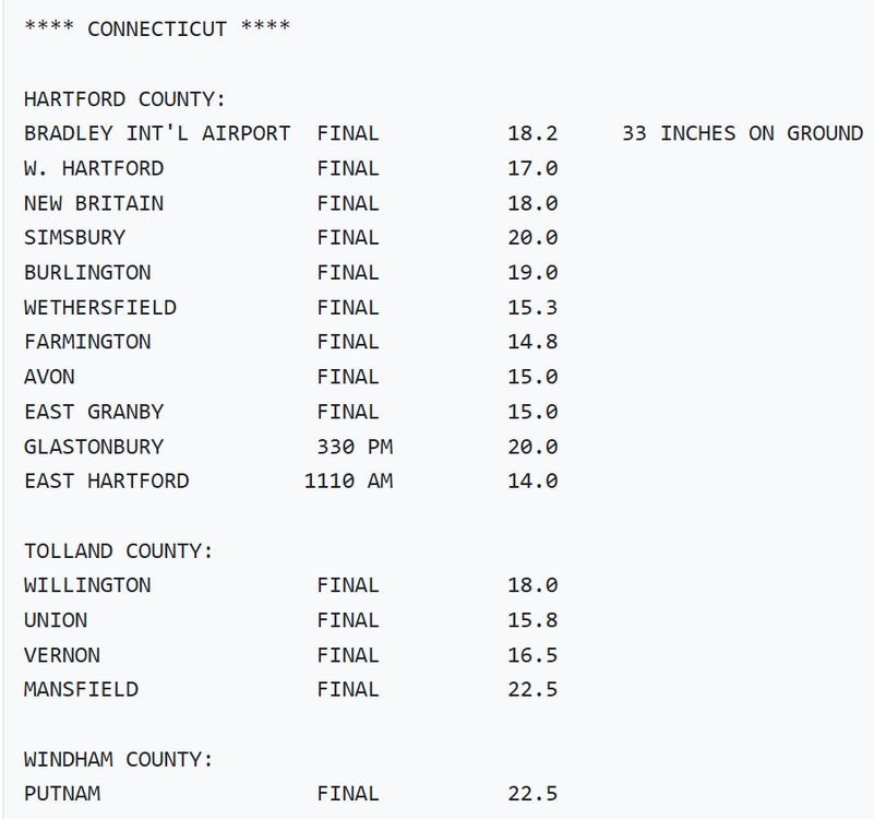 I just updated the Blizzard of '96 with new maps as well a couple others. I made significant changes to these maps with new reports from the OPU. Mostly the contours/numbers went way up especially for CT/SE MA. It's funny that the PNS/OPUs from around this time, mostly older 90s and 00s, often do not match up with what's in the nowdata (F6). I'm always going to default to what's in the official record books but it makes me wonder sometimes if those numbers are the mistakes and not the PNS. This is another instance where BDL is way off from the F6. BDL on the OPU is 18.2 which seems about right but the F6 is 15.8". Also, i think BDR is totally ridiculous. 15" when all the surrounding reports are around 2 feet. So i'm supposed to believe that BDR got 5" more in the Blizzard of 26 than 96? There's no shot 2026 eclipsed 1996 there, and by 5 inches.