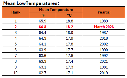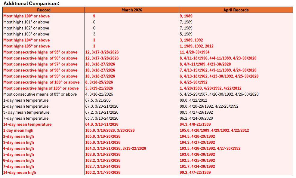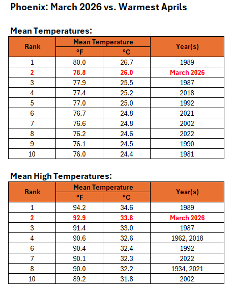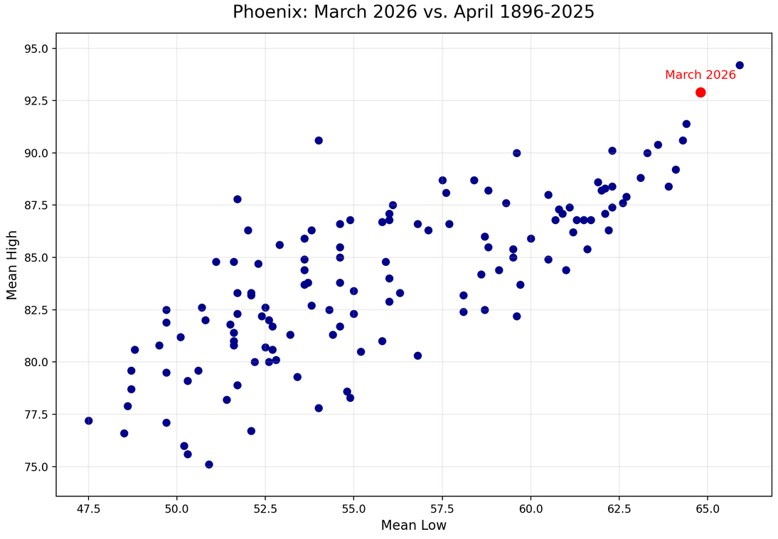 Powered by a monster heat dome that would be a rarity during the summer, Phoenix and the Southwest experienced mind-boggling warmth during March. Chart 1: Daily Temperatures: Chart 2: Return Time of Monthly Mean Temperature (Historic Period): The warmth has been persistent since December. December, February, and March set new records for warmest December, February, and March on record. As a result, Phoenix also experienced its warmest December-March period by a large margin.