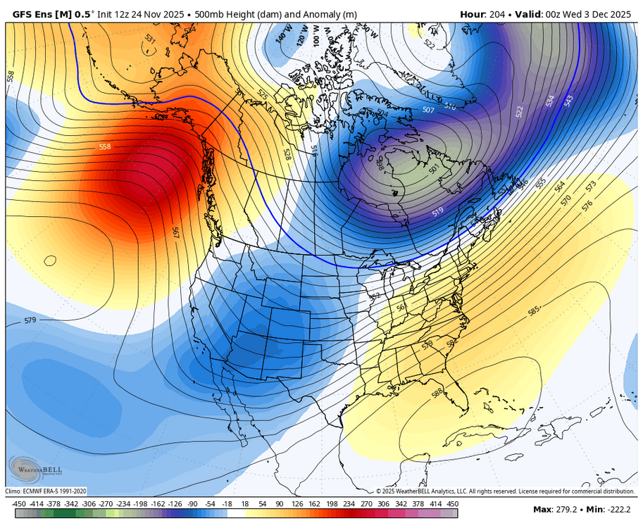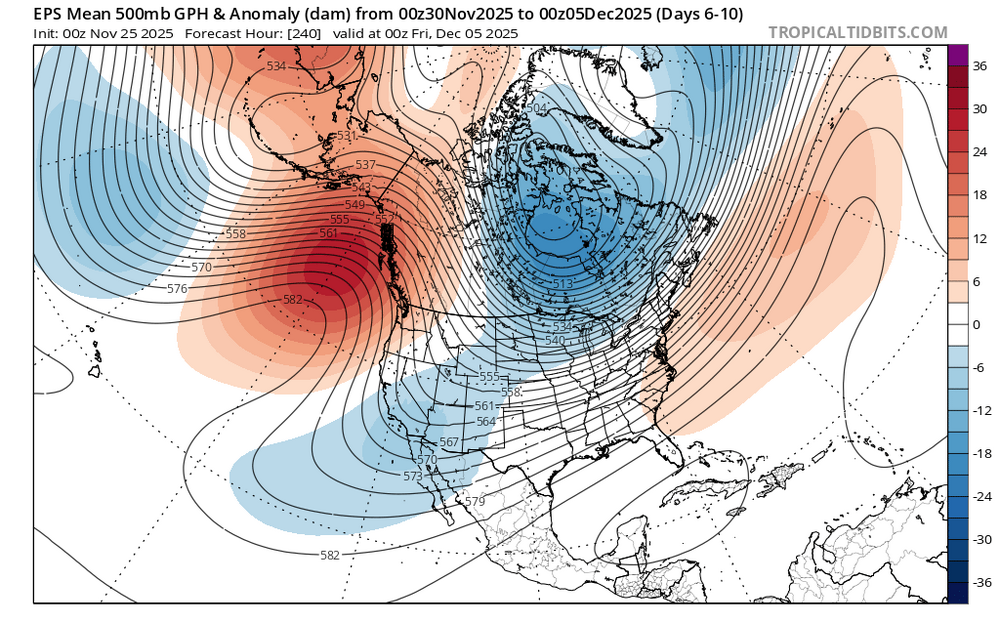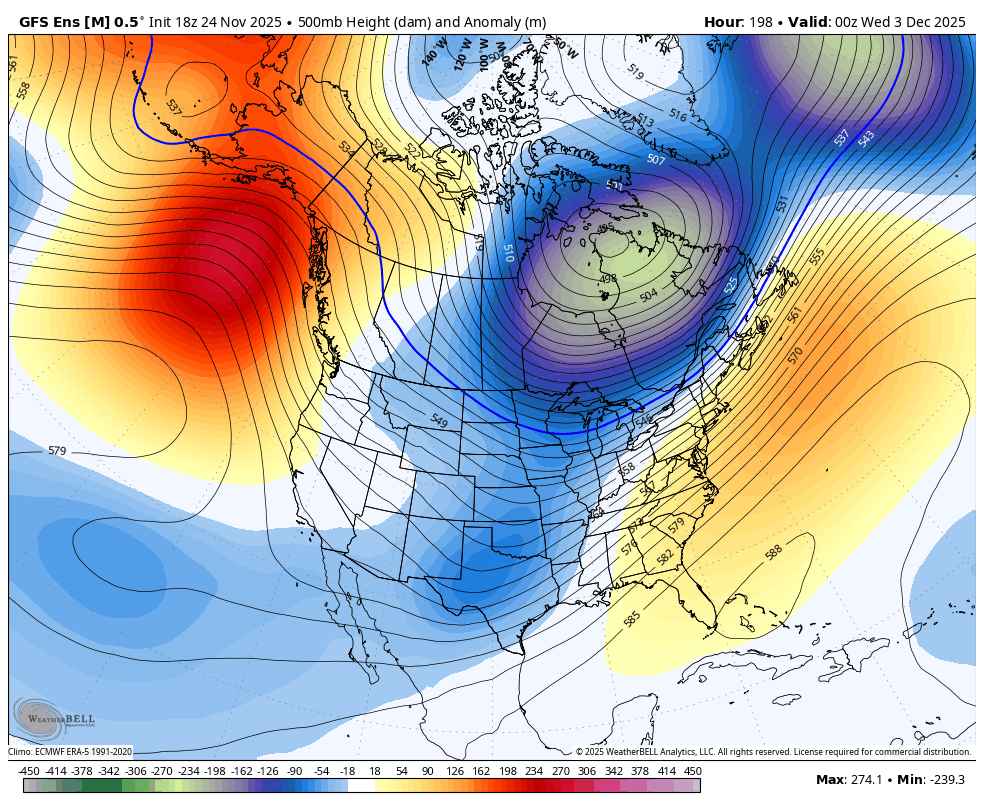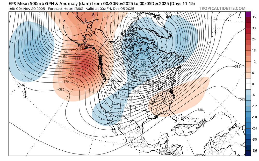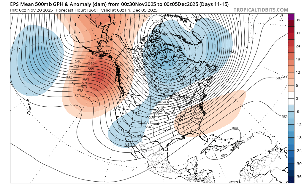 The ensembles (GEFS, GEPS, EPS) want to retrograde the Alaskan ridge (-EPO) to an Aleutian ridge (-WPO) by the beginning of the 2nd week of December. So you end up with a -WPO/+EPO/-PNA setup. It’s been a consistent theme for several cycles now