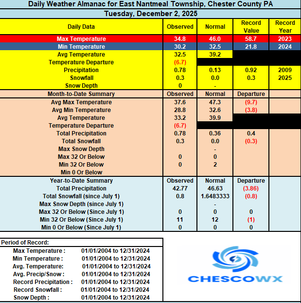 Low of 29.2 and the heaviest frost of the year. Car doors were frozen shut with residual moisture from yesterday’s rain. Posted in the November obs but picked up 1.09” yesterday and high topped out at 44.1