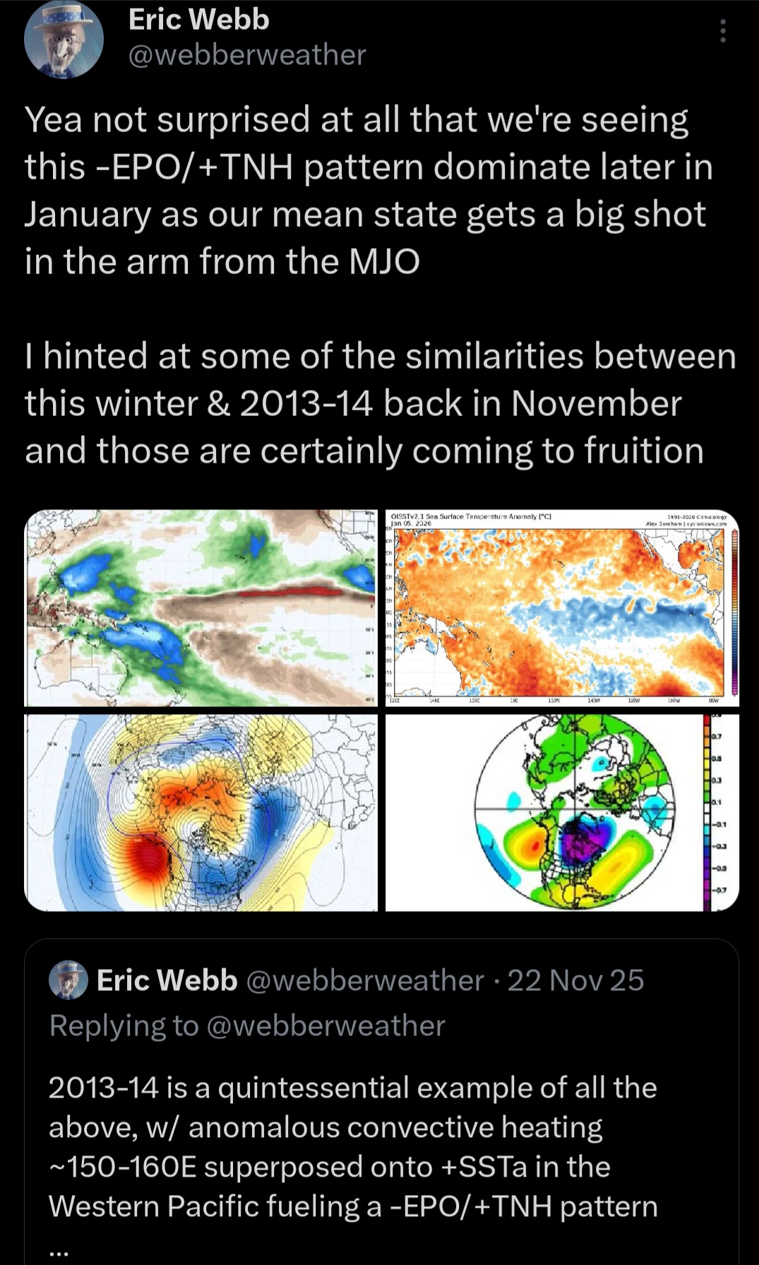 Most of you know that I'm an optimist, but even I can't help but get a little bit worried. We're wasting half of January to wait for a 7/10 highly volatile -EPO/+TNH pattern and a wild card February and March. Will it be as bad as 22-23. 19-20, 16-17, etc.? I don't think so yet.