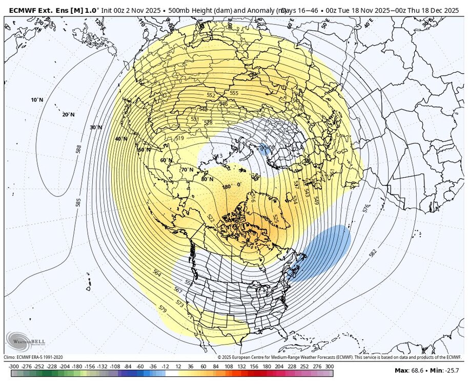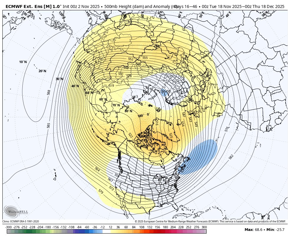 48 / 46 and cloudy with rain into SNJ from the sothern sstem exiting off the SC coast with some clearing later today. Upper 50s to low 60s for most. Dry and warm rest of the week back into the mid 60s, perhaps upper 60s Wed. Next shot at light rain this coming weekend which could trend cloudier and break the nice weekend string we've had. Trough into the northeast 10 - 12 with the coldest air of the season and first freezes possible, beyond there warmer towards mid month - ridge into the east potentially much warmer. 11/3 - 11/7 : Above normal / dry overall 11/8 - 11/12 : Cooler / cold - first freezes possible 11/10-11/12, rain / storm pssible 11/13 - Beyond : Warming to and above normal - ridge builds east.