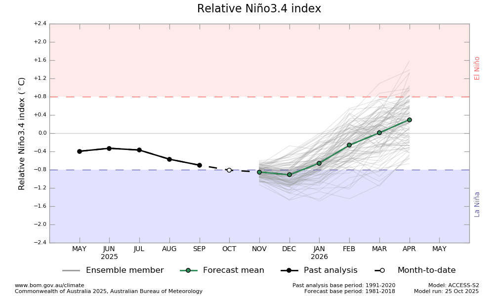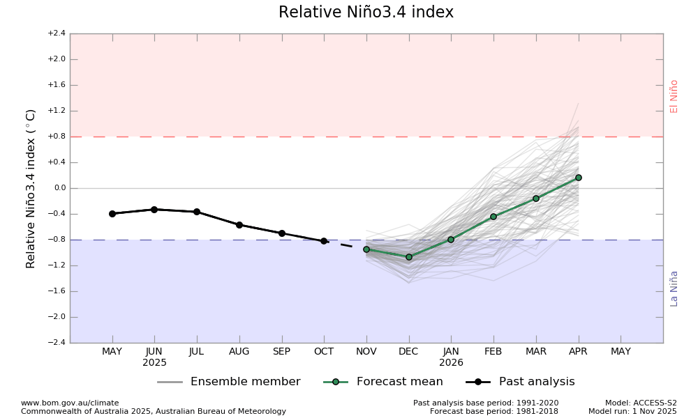 New BoM RONI prog (I love that they prog RONI these days!) is slightly cooler than last week’s prog with NDJ low at -0.9 vs last week’s -0.8, possibly being aided by current very strong -IOD. Last week’s RONI progged low: -0.8