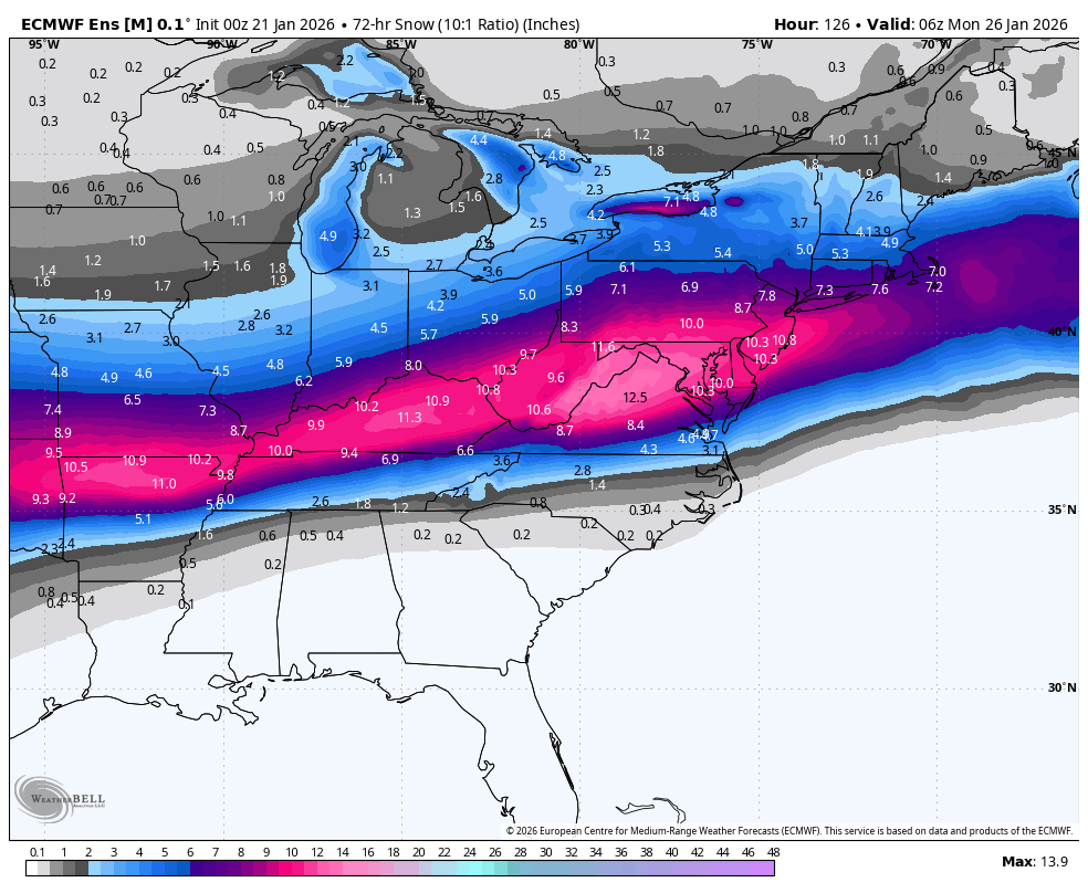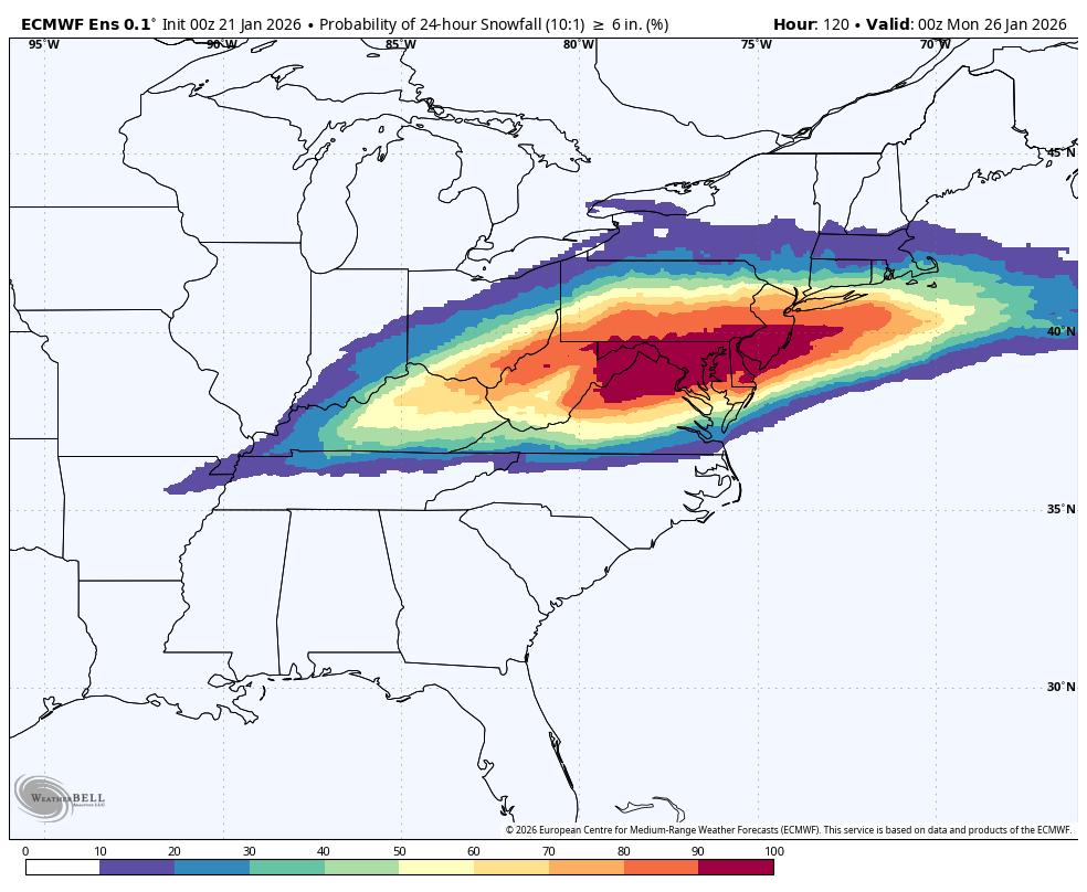 0z Euro ensembles continue to look better for heavier snows in PA, probs for 6”+ in a 24 hour period (at just the 10:1) are 80% or higher for about the southern third of the state now. 0z Euro ensemble snowfall mean -