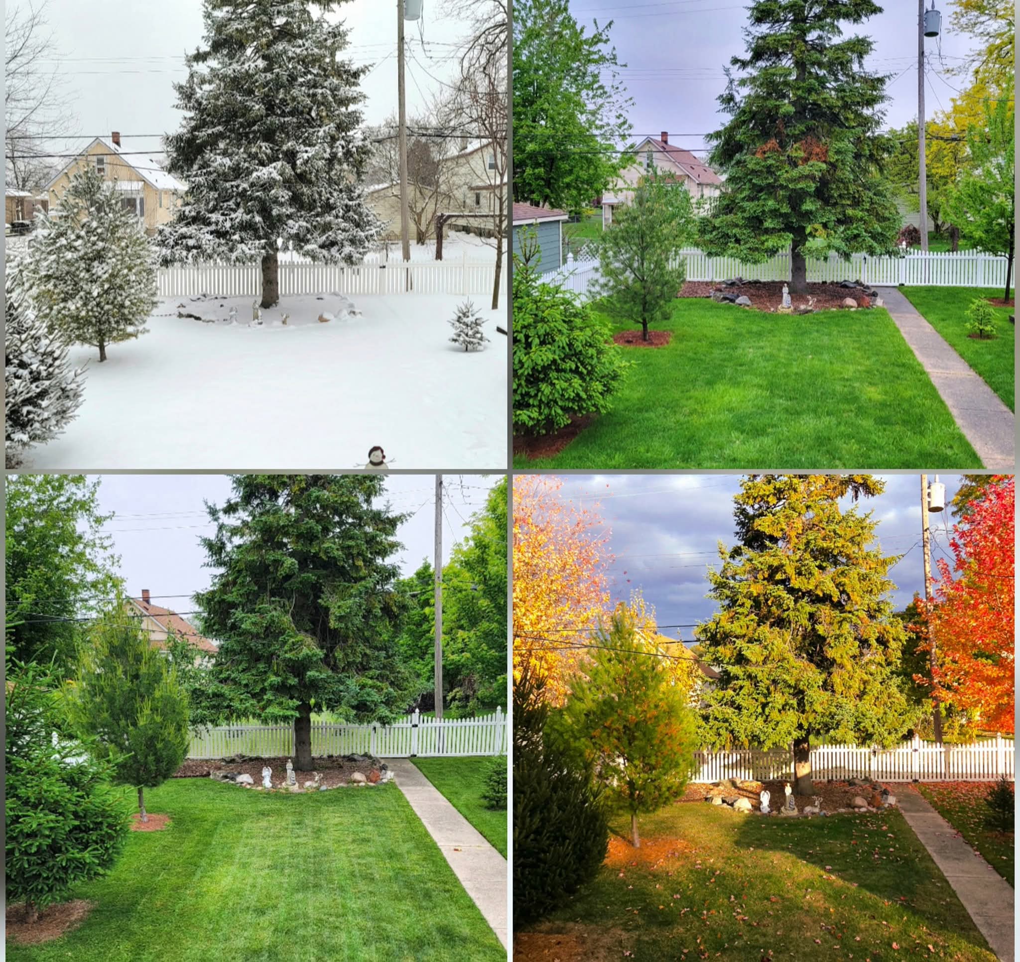 I posted something similar a while ago, but was able to update it with the newest Fall pic. Looking into my backyard. Always feel lucky to have 4 seasons, and it's really neat to see it in a picture form. I didnt have a good spring Pic, had to use one from last May, but now I think I want to do a comparison shot every year.