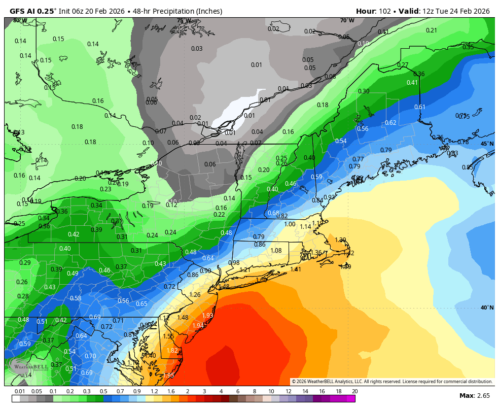 GFS AI brings 1 - 1.5” QPF across the area (less well N&W). It’s been showing a relentless push to the NW with higher precip amounts.