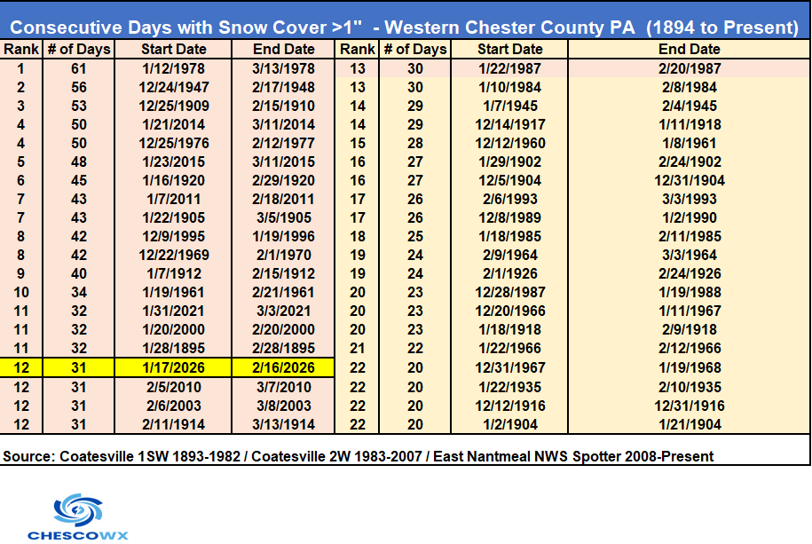 31st consecutive day with snow cover here in Chesco - tied for the 12th longest stretch since 1894 and 17th overall. -