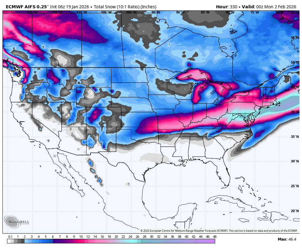 At some point I think ratios are going to matter with this cold. You can clearly see it on the precip maps where we might get less precip but the higher ratios make up for it in snowfall. I think we are any a great spot and if we have a jump north I assume the cold is not as strong and its mostly a wash with accumulations? Euro AI shows only a 2 inch difference between Fredericksburg and Mon county NJ. A distance of 250 miles.