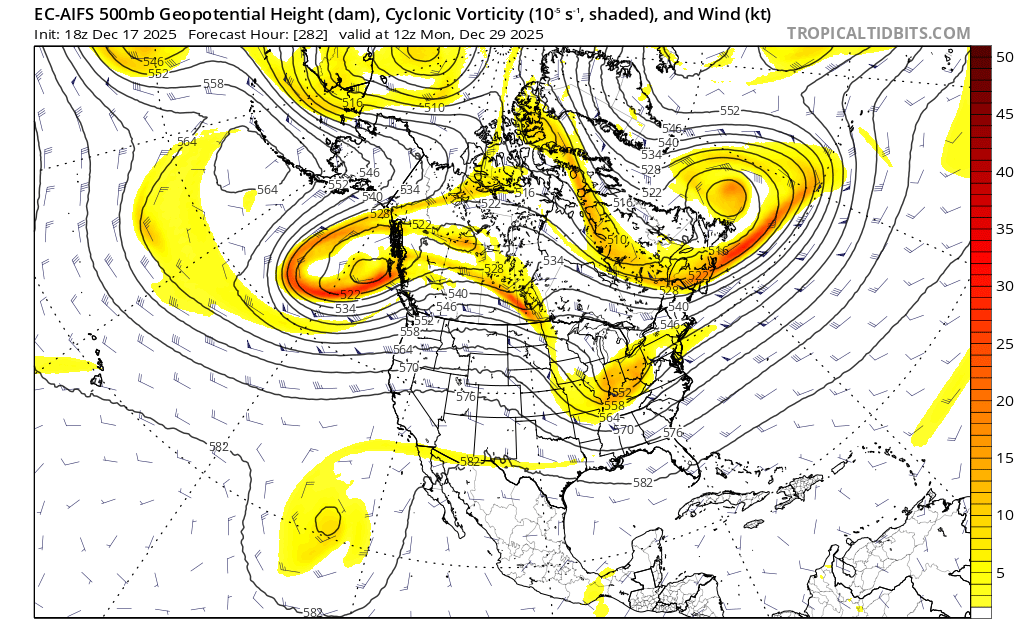 12/29-30 is probably our best chance, but it's still a long shot. OPs have been showing ways we can score for a decent amount of time and ensembles have a decent signal, but we're kinda grasping on straws here lol. EPS shows that kind of ugly central-US ridge, but it also shows an pretty strong east-based -NAO. Even though it's a -NAO, it's an east-based -NAO, so while it'll help with a torch it's not going to do much otherwise IMO. h5 flow would suggest WAA aloft but at least it's somewhat cold at the surface so snow changing to mix or rain has a decent chance. More of a conditional setup where timing is absolutely key, so wouldn't hold too much hope unless the -PNA/+EPO trends towards neutrality and/or that NAO block trends more west. We still have time though, 288 hours is more than enough time for those things to happen.