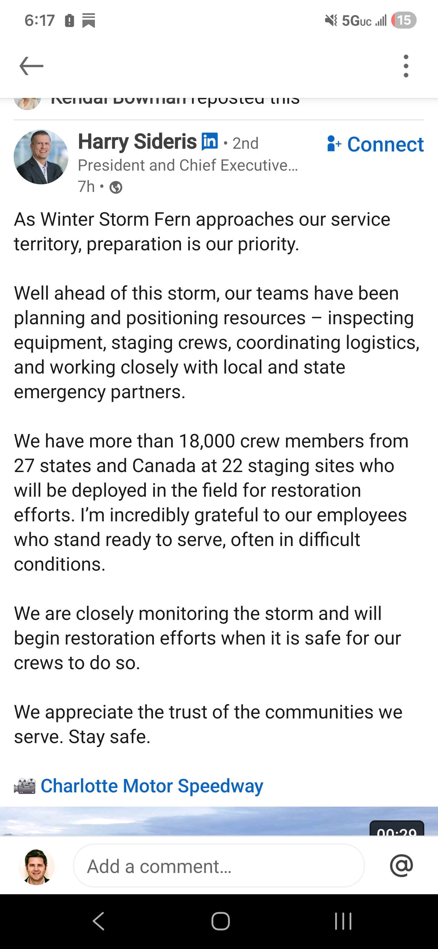 11. Duke has 18K workers from 27 states and Canada ready to go. The good news is they can pull from outside the Carolinas (IN/OH,FL) where they have territory where the winter storm is not slated to be as destructive to the grid.