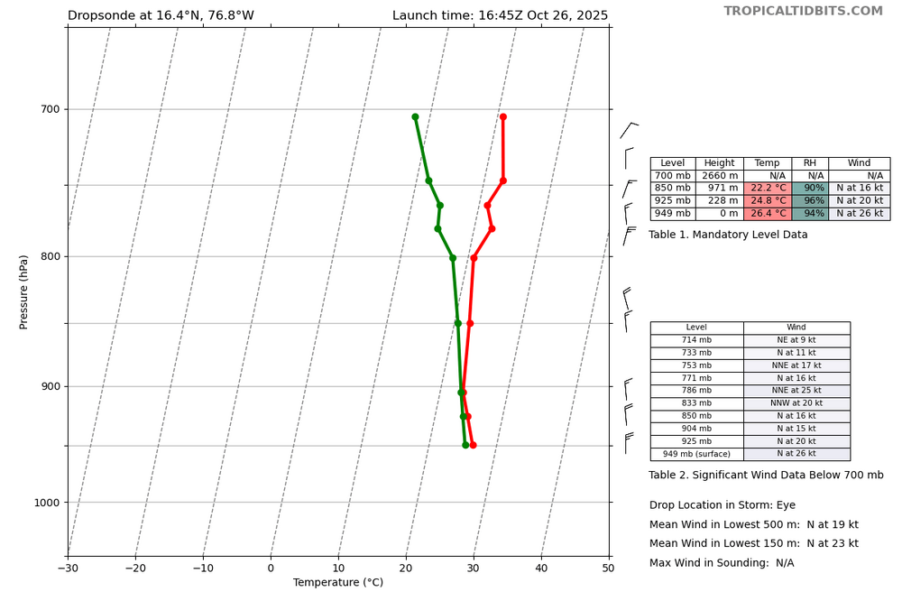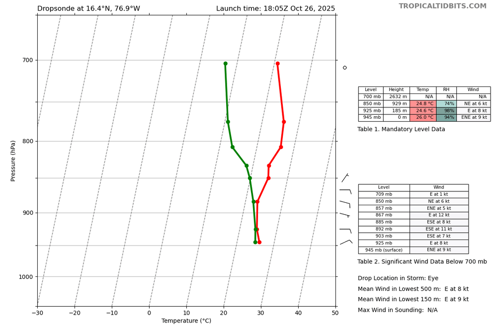 Latest dropsonde data supports Melissa is not only intensifying but is likely hours away from another potential rapid intensification process. Both images are 2 hours apart, and show an incredible structure change to Melissa’s eye. So while the internal process is not an ERC, it was very much structural and likely about to wrap up. The internal process was truly hindering mixing. First pass subsidence was not fully established. The second pass subsidence is highly noted. This is a precursor to a high-end hurricane going nuclear.