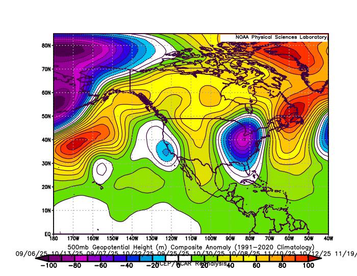 During more +PNA intervals like this fall the, the Southeast ridge was focused to the east building into Eastern New England and Canada. So these frequent WAR and Southeast ridge patterns are interchangeable. They both have been leading to dominant Great Lakes and hugger tracks whether we have had +PNA or -PNA patterns over the last 7 years since 2018-2019. 10 wettest days storm track 500 mb composite this fall around the area with dominant Great Lakes cutter and hugger storm tracks and strong +PNA WAR pattern