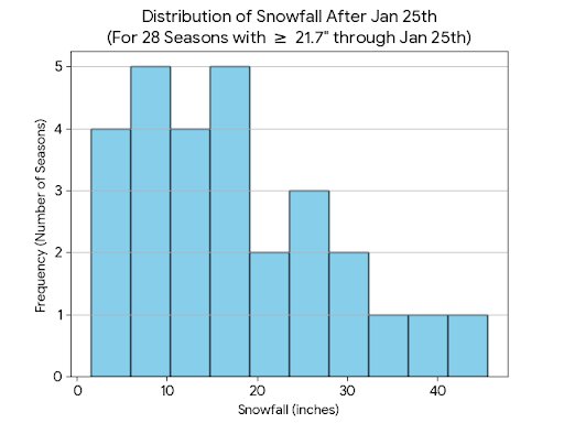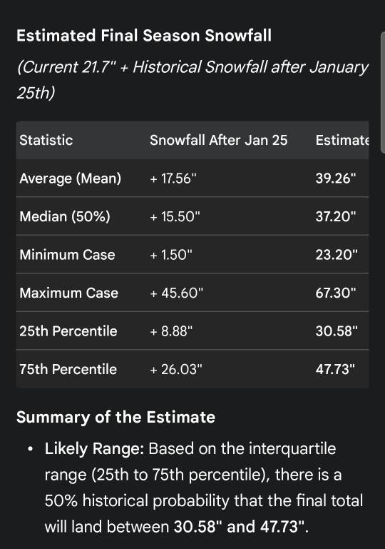 Where do we go from here? Analyzing 21.7" by Jan 25th (Harrisburg/Middletown) Hey eve With our current seasonal total sitting at 21.7" as of January 25th, I decided to dig into the historical archives for the Middletown-Harrisburg area to see how this stacks up and what "history" says about the rest of our winter. I looked at every season since 1899 to find years that met or exceeded our current 21.7" by today’s date. Here’s the breakdown: The Historical Analogues There are 28 seasons in our history that reached this mark by Jan 25th. * Average Final Total: 48.4" * Snowiest Year in this Group: 1960-1961 (Finished at 81.3") * Least Snowy Year in this Group: 1987-1988 (Finished at 26.7") What’s Left in the Tank? (Snow after Jan 25th) Looking only at what fell after today’s date in those 28 seasons: * Average remaining snow: 17.6" * Median remaining snow: 15.5" * The "Boom" Scenario: 1993-1994 added a massive 45.6" after Jan 25th! * The "Bust" Scenario: 1953-1954 only added 1.5" more. The "Confidence" Forecast Based strictly on these 28 historical matches, here is the probability for our final seasonal total: * 90% Certainty: We finish with at least 27.1" * 75% Certainty: We finish with at least 30.6" * 50% Certainty (The Coin Flip): We finish with at least 37.2" * 25% Certainty: We finish with at least 47.7" * 10% Certainty (The Longshot): We finish with at least 53.4" Context: The Big 2-Day Hitters For those wondering about the "big one," here are the top 2-day totals ever recorded in our data: * 30.2" (Jan 22-23, 2016) * 25.0" (Feb 11-12, 1983) * 22.2" (Jan 7-8, 1996) * 21.0" (Jan 15-16, 1945) * 20.4" (Mar 13-14, 1993) Summary: History suggests we are about 55-60% of the way through our seasonal snowfall. If we follow the "average" of our historical peers, we're looking at another 17" or so before spring. What do you guys think? Do we follow the 1994 path (+45") or the 1954 path (+1.5")? [emoji3587][emoji409] Sent from my SM-S731U using Tapatalk -