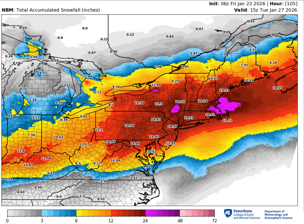 Good AM discussion out of OKX The overall synoptic picture into early next week continues to sharpen. At the surface, arctic high pressure slides east from the Great Lakes into the Northeast this weekend. Meanwhile, low pressure develops and tracks through the South before redeveloping off Cape Hatteras, passing near or just inside the 40N/70W benchmark into Monday. Aiding the potential for snowfall, an arctic air mass settles in ahead of the storm. 925 mb temps look to fall toward -20C or below on Saturday, with surface temperatures progged in the teens during the afternoon, setting up one of the coldest days in several years. This will allow snow to fall everywhere at the onset, which looks to develop rather quickly either very late Saturday night, or more likely Sunday morning around or after daybreak. Periods of heavy snow then appear likely late Sunday morning through the afternoon via the strong frontogenetic and thermal forcing aided by an anticyclonic upper jet to the north. Snowfall rates in this period likely eclipse 1 in/hr at times, perhaps closer to 2 in/hr. Given the cold air mass in place initially, SLRs start out on the higher side (15-18:1) at onset, gradually falling back toward 10:1 or lower along the coast by late afternoon as the mid levels warm. With guidance having adjusted to a closer to the coast surface low, the proximity introduces the possibility of enough warm air intrusion around 800 mb for the snow to mix with or change to sleet Sunday evening. Best chances for this are along the coast, including Long Island and NYC metro. Lower confidence in this occurring going north, with all snow still the most likely solution into the Lower Hudson Valley and Southern Connecticut. Freezing rain or drizzle also cannot be ruled out, though significant icing appears unlikely. As the coastal system deepens and lifts north and east into Monday, the boundary cools once again, and any wintry mix likely tapers as snow showers or flurries into late Monday morning or afternoon. Any additional accumulation is likely light. Forecast snowfall totals have decreased slightly along the coast. This is due to the increased potential for mixing as the warmer air aloft works in. It should be emphasized though the heaviest and steadiest precipitation is expected Sunday morning into early evening, with the bulk of snow accumulation occurring prior to any potential changeover. With QPF progged over an inch, areas that remain all snow should be able to yield double digit snowfall. The question becomes how much warm air is able to work in and force a changeover to sleet, cutting down snow totals. All said, still expecting a widespread 8 to 14 inches across the region, with localized amounts perhaps approaching a foot and a half where best banding sets up and ptype remains all snow. Greatest likelihood for this is across the interior. We remain just over 48 hours from event onset, so opted for no headline changes with this update. It appears likely warnings will be warranted for all areas later today or tonight, dependent on no significant deviations in forecast thought. Continue to monitor the forecast on what is increasingly likely to be a major winter storm with significant disruption to travel and daily life early next week. -
