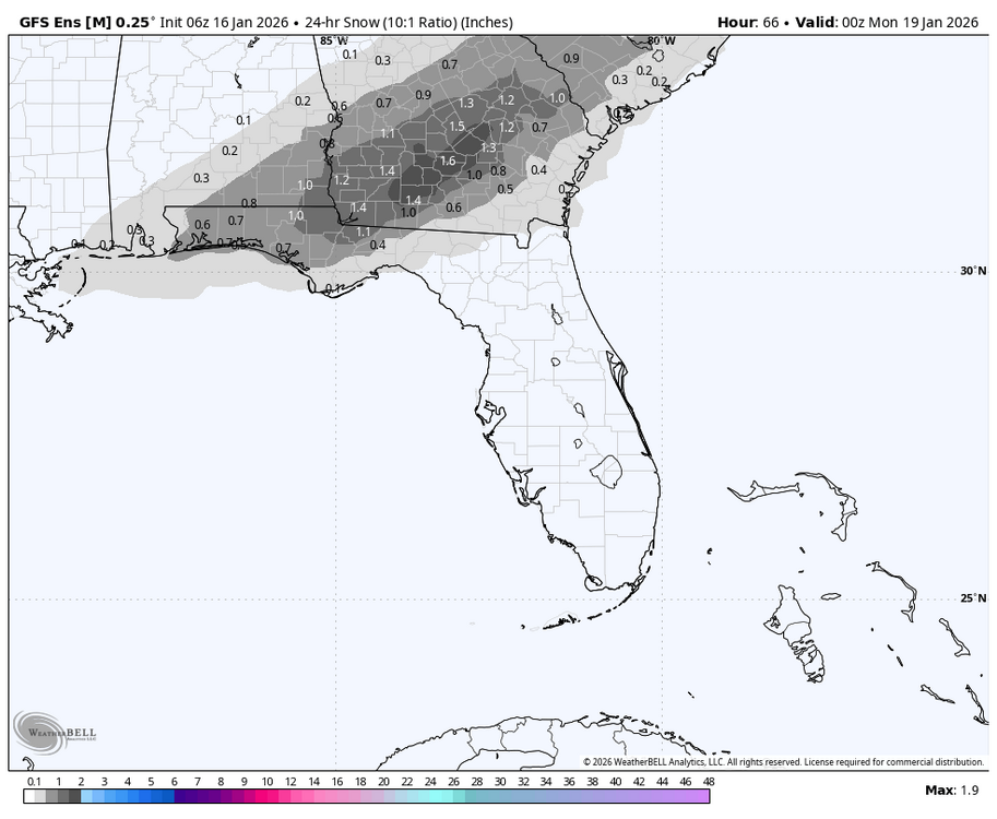 Very rare S GA snow: will it happen? This potential is exciting, but accumulations are probably overdone. I’ll be considering driving to it if it’s within a 1-1.5 hours drive out I-16 assuming the roads are not too affected, which is my guess due to marginal 2m temps. Right here, I’m hoping for a few flurries mixed in with the rain, but there could easily not be any snow mixing in as it doesn’t look quite cold enough right now though I’ll keep monitoring for model changes: 6Z 1/16 EPS: 6Z 1/16 GEFS: 6Z 1/16 Euro AI ens is more realistic imho with lower accums (<1”) but even that would be a rare event: