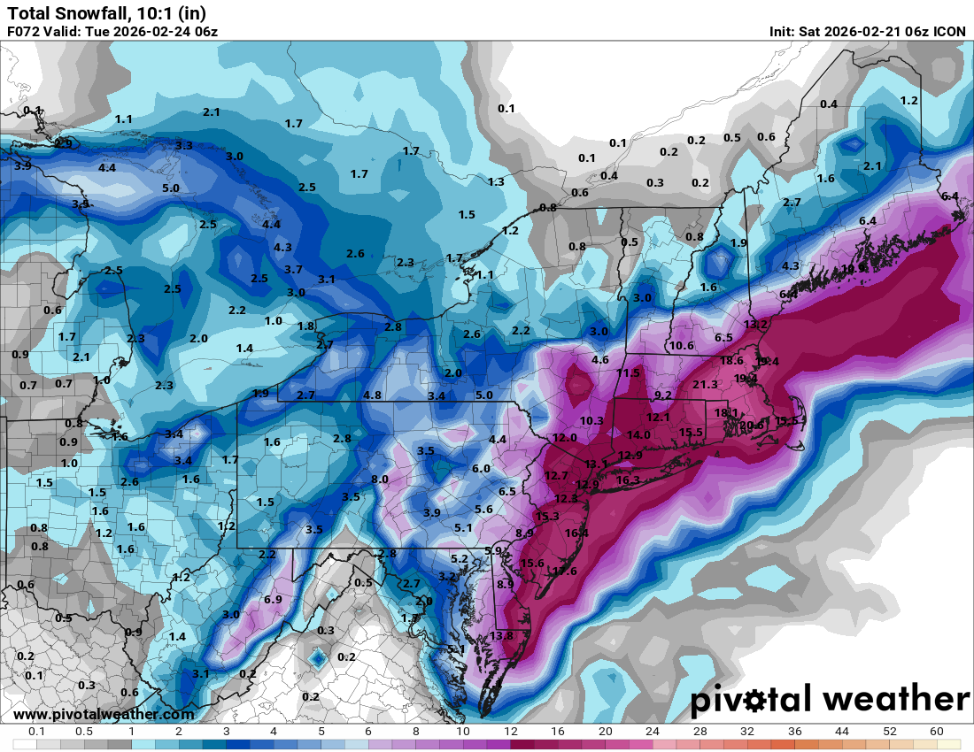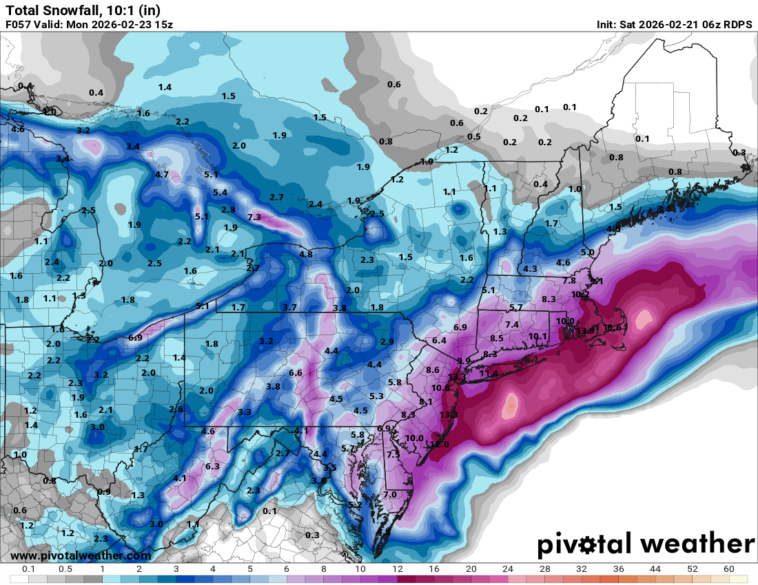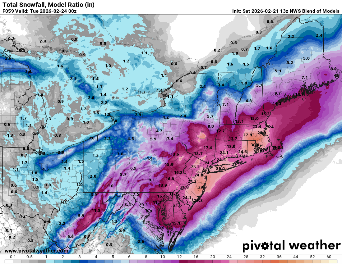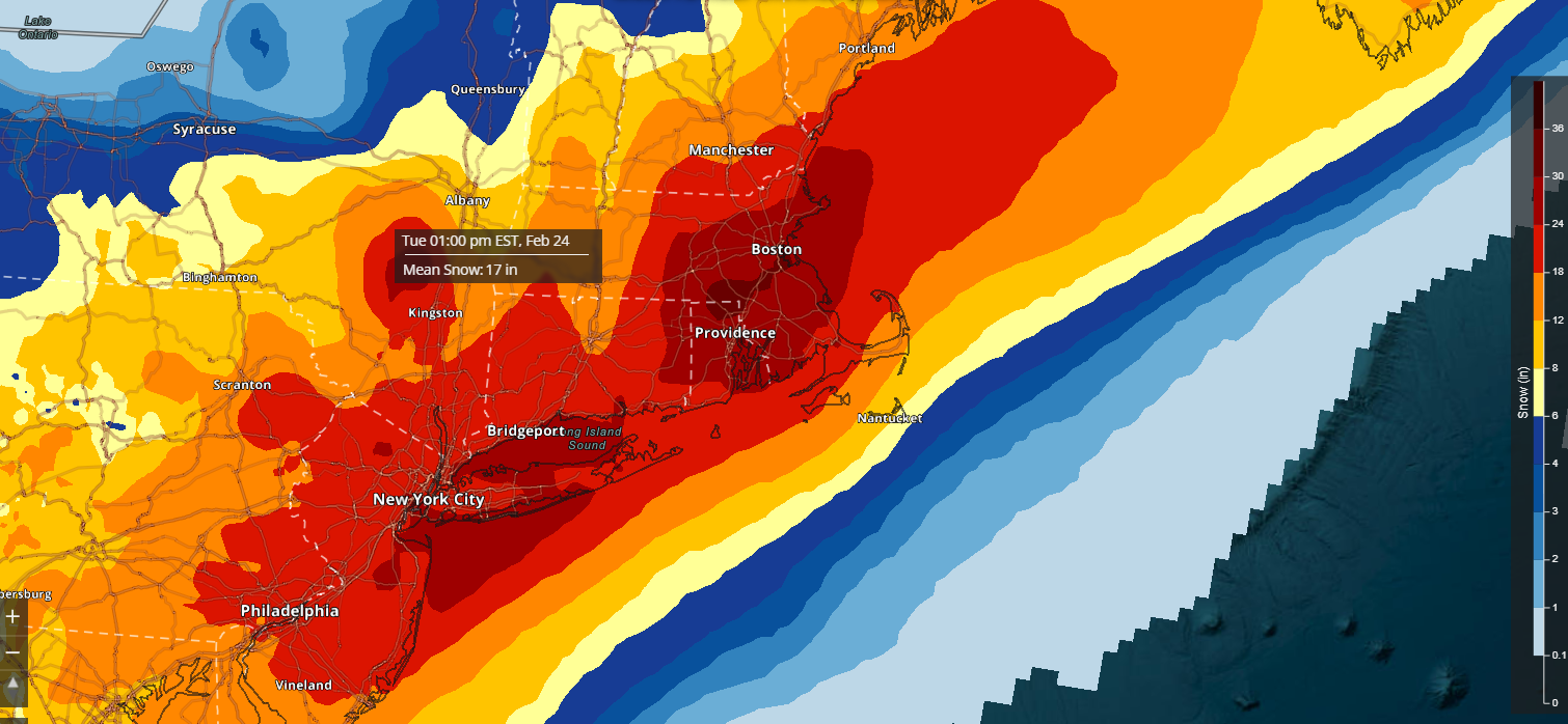 13z NBM is pretty wild. The mean(!!!) has a large area of 24-30" across the Boston/Providence area (even 30-36"). The diagnostic ratios are likely too high considering winds will be strong.