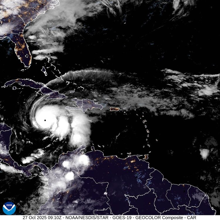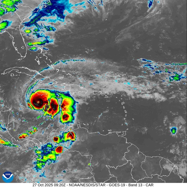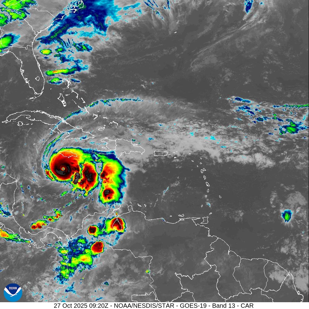Most recent long-range radar scan. The eyewall remains uniform and intense. It does appear a concentric outer band is trying to form around the periphery of the eyewall. We still have 24-28 hours until landfall. That is plenty of time for an EWRC to begin. The forecast is for Melissa to be a Category 5 at landfall, but internal structural changes could still bring down that intensity to Category 4. But again, that is not necessarily a good thing for the island, as the windfield would expand east towards higher populated areas. I actually do think the intensity will fluctuate down by landfall as I still think outer banding will get its act together and weaken the small eye by tonight. It is very difficult for a high-end TC like this to maintain that intensity for that many hours without fluctuations. Time will tell.