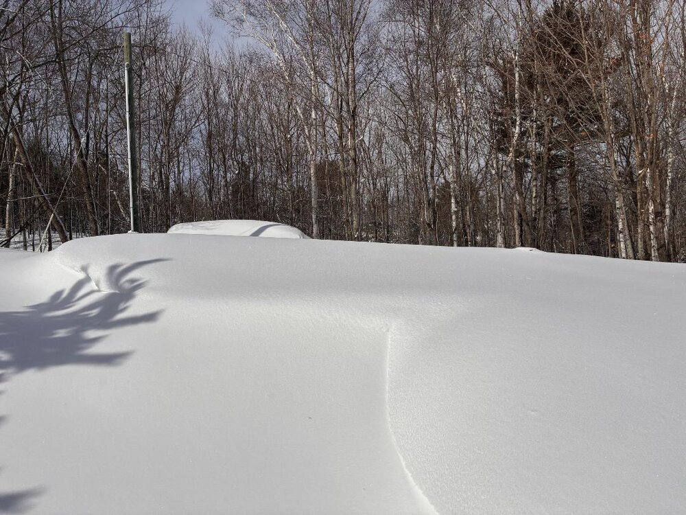 You'd finally get your fill of snow! This is what 5.5+ feet of snow looks like. Pretty much standing in the same spot as the late August pic this past Summer. Took some weight off the roof as well. Inside the house is like a cave. EDIT: The lesser snow on the left side of the pic is a path i blew to the propane tank a few weeks back.