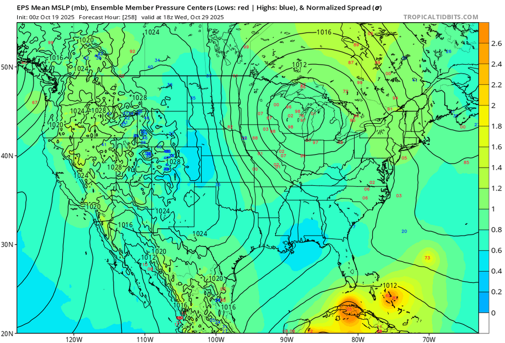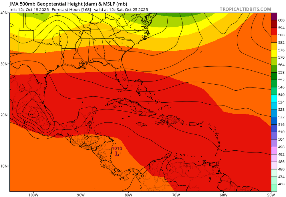 AIFS seems off showing too much of a hole in the W Atl ridging N/NW of 98L. The other ML models don't support its scenario of 98L curving sharply NE toward Hispaniola. https://x.com/yconsor/status/1979887548240650357