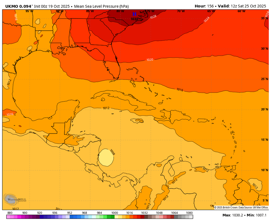 The 0Z UKMET once again has just a rather weak low (not even a TC on the textual output; it has yet to show TCG in the Caribbean on this output though it awhile back had several runs with TCG east of the Lesser Antilles) and again into Nicaragua. The last 5 runs have shown a weak low either hitting Nicaragua (0Z 10/19, 12Z 10/18), barely E of Nic. but heading into it (0Z 10/18, 12Z 10/17), or still 200 miles E of Nic. but likely headed into it (0Z 10/17). Looking at the H5 vorticity, it appears that as the AOI on the TWO comes into the E Car that a portion of it turns sharply right like the GFS but unlike that model it never develops. Then what looks like a split from this, possibly incorporating additional vorticity coming off northern S America, causes the weak low to move into the SW Caribbean, which then goes into Nicaragua. So, the UKMET remains a SW outlier. I should add that yesterday’s 12Z JMA is similar and it has been similar all of the way back to the 12Z 10/15 run. So, the JMA has had 4 12Z runs in a row with just a weak low into Nicaragua or just offshore headed there. Thus the UKMET and JMA have a good chance to both either fail badly or end up doing the best of the major operationals with this. ——— 0Z 10/19 UKMET 156 12Z 10/18 JMA 168
