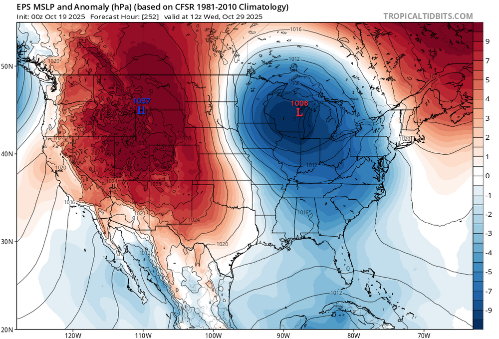 51 / 46 (11 Hours of daylight) Clear then partly / mostly cloudy later. Warmest of the next week or two perhaps much longer than that. low - mid 70s in the warmest spots (76/77). Front comes trough later this evening and overnight 0.50 - 1.00 of rain (most north). Dry week - near normal overall warmer Tue cooler Wed - Fri. Next weekend looks dry and cooler into the week of the 27th.. Cutoff storm into the midwest to be ironed out along with what will be Melissa in the 10/29 - 11/3 period. Could be an interestingly unsettles close o the month. 10/19: Warmest of the next week or longer 10/20 - 10/27: Near normal overall coolest next weekend 10/28 - 11/3 : Cutoff into the Midwest, Melissa could be near along the EC