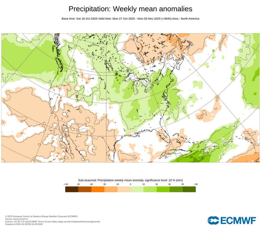 The latest teleconnection forecast calls for a negative AO, negative NAO, and positive PNA in the closing days of October and opening days of November. Such a combination can favor a period of wetter weather. The latest ECMWF weekly forecast for October 27-November 3 shows wet anomalies. It should be noted that the Week 2 CFSv2 anomalies are on the dry side of normal. Therefore, at least for now, the period merits watching, but there remains considerable uncertainty. I suspect that the odds are somewhat more in favor of the ECMWF outcome given historic outcomes, but that won't become clearer until the operational guidance moves into its high-skill forecasting range.