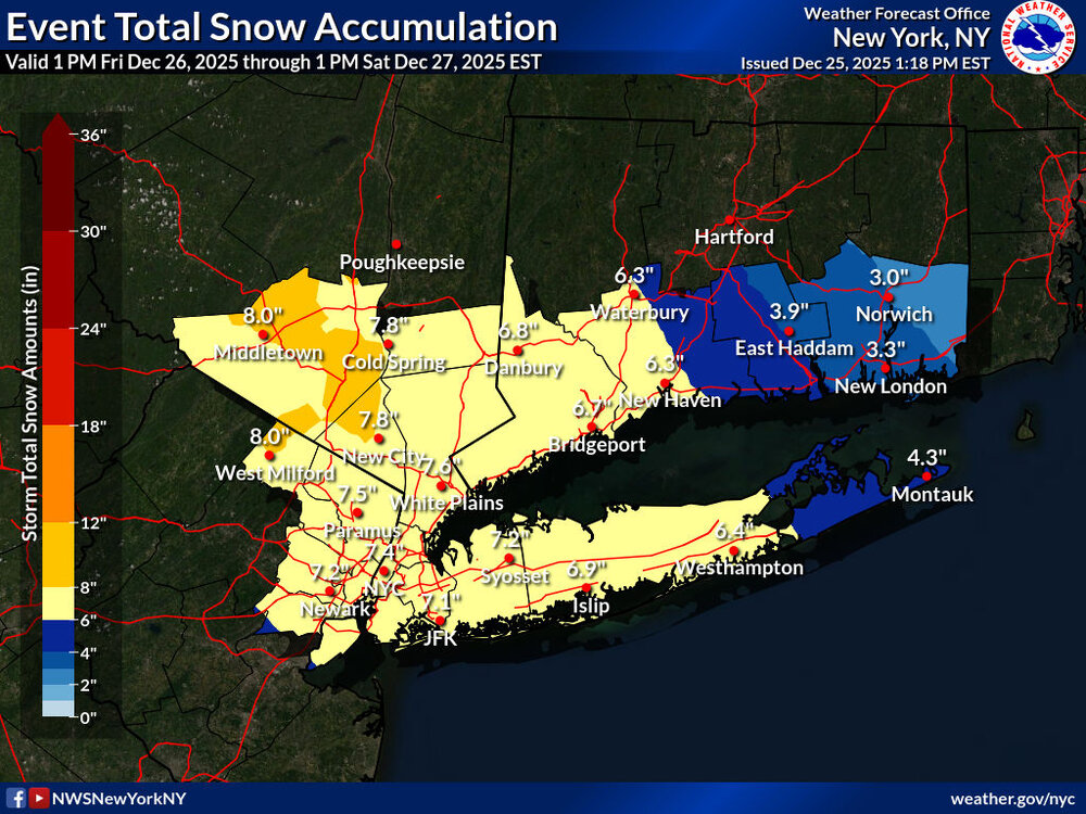 02-004-006-103>108-NYZ067>075-078-080-176>179-260900- /O.UPG.KOKX.WS.A.0004.251226T2100Z-251227T1800Z/ /O.NEW.KOKX.WS.W.0003.251226T2100Z-251227T1800Z/ Northern Fairfield-Southern Fairfield-Western Passaic-Eastern Passaic-Hudson-Western Bergen-Eastern Bergen-Western Essex- Eastern Essex-Western Union-Eastern Union-Orange-Putnam-Rockland- Northern Westchester-Southern Westchester-New York (Manhattan)- Bronx-Richmond (Staten Island)-Kings (Brooklyn)-Northwest Suffolk- Southwest Suffolk-Northern Queens-Northern Nassau-Southern Queens- Southern Nassau- 119 PM EST Thu Dec 25 2025 ...WINTER STORM WARNING IN EFFECT FROM 4 PM FRIDAY TO 1 PM EST SATURDAY... * WHAT...Heavy snow expected. Total snow accumulations between 4 and 8 inches. * WHERE...Portions of southern Connecticut, northeast New Jersey, and southeast New York. * WHEN...From 4 PM Friday to 1 PM EST Saturday. * IMPACTS...Travel could be very difficult. The hazardous conditions could impact the Friday evening commute.