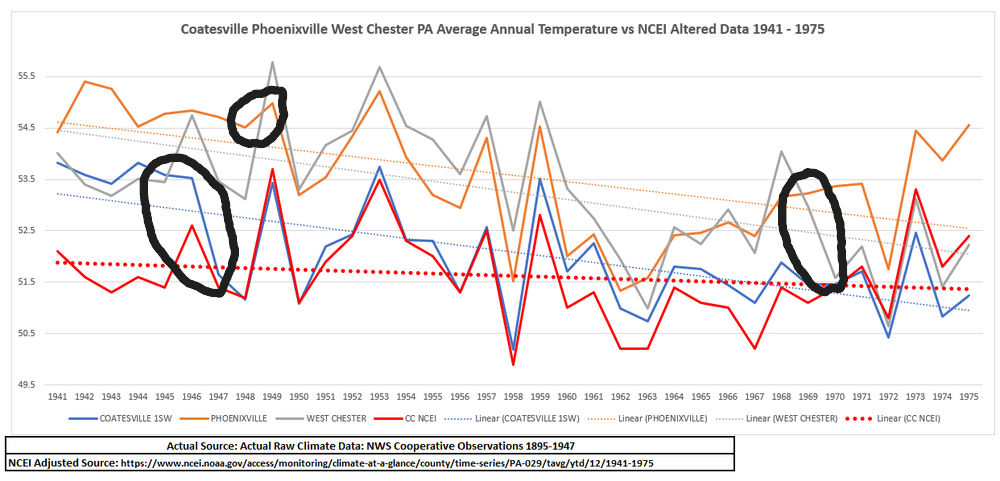 I circled the station moves: Coatesville 1946 and 47, Phoenixville 1949 and West Chester 1970. Each move caused roughly 2F cooling. Easy to spot the station changes as the year-to-year temperature change at each move station differed from the other two stations. As I have shown previously, take out the station moves by plotting before and after move data separately and NOAA is a close match to the raw data.